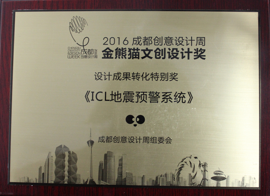 2016年11月26日,2016成都創(chuàng)意設(shè)計(jì)周?金熊貓文創(chuàng)設(shè)計(jì)獎(jiǎng)?lì)C獎(jiǎng)盛典在成都舉行,成都高新減災(zāi)研究所自主研發(fā)、由成都市美幻科技有限公司實(shí)現(xiàn)轉(zhuǎn)化的“ICL地震預(yù)警系統(tǒng)”獲得組委會(huì)特別大獎(jiǎng)——設(shè)計(jì)成果轉(zhuǎn)化特別獎(jiǎng),以鼓勵(lì)美幻科技8年來(lái)始終專注于地震預(yù)警技術(shù)研發(fā)、成果轉(zhuǎn)化與應(yīng)用創(chuàng)新,并安全服務(wù)社會(huì)5周年的工作。