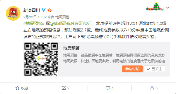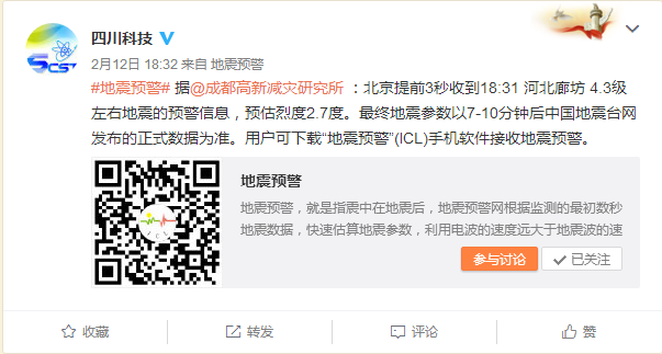 四川科技微博發(fā)出地震預警信息