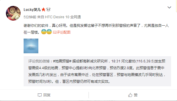 微博用戶收到地震預警警報