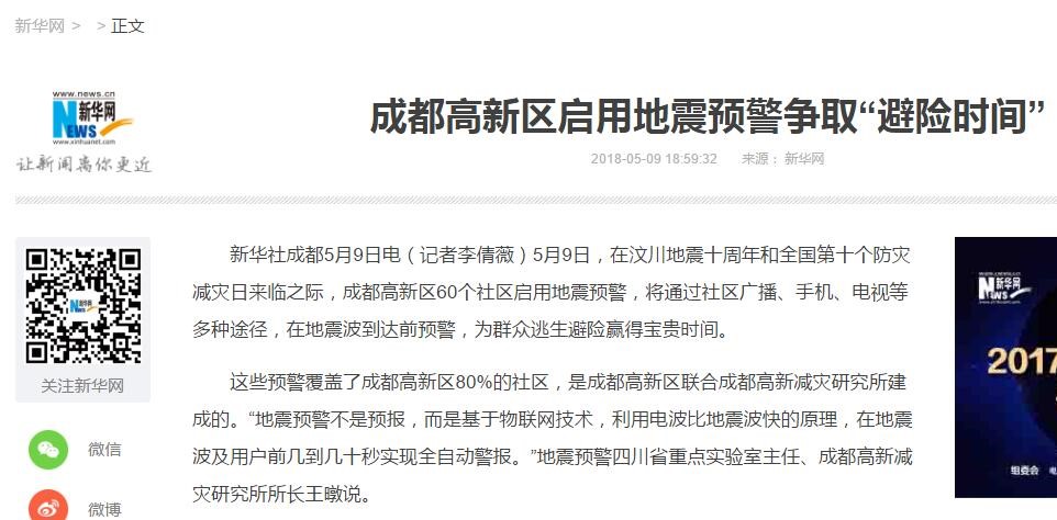 新華網(wǎng)——成都高新區(qū)啟用地震預(yù)警爭取“避險時間”